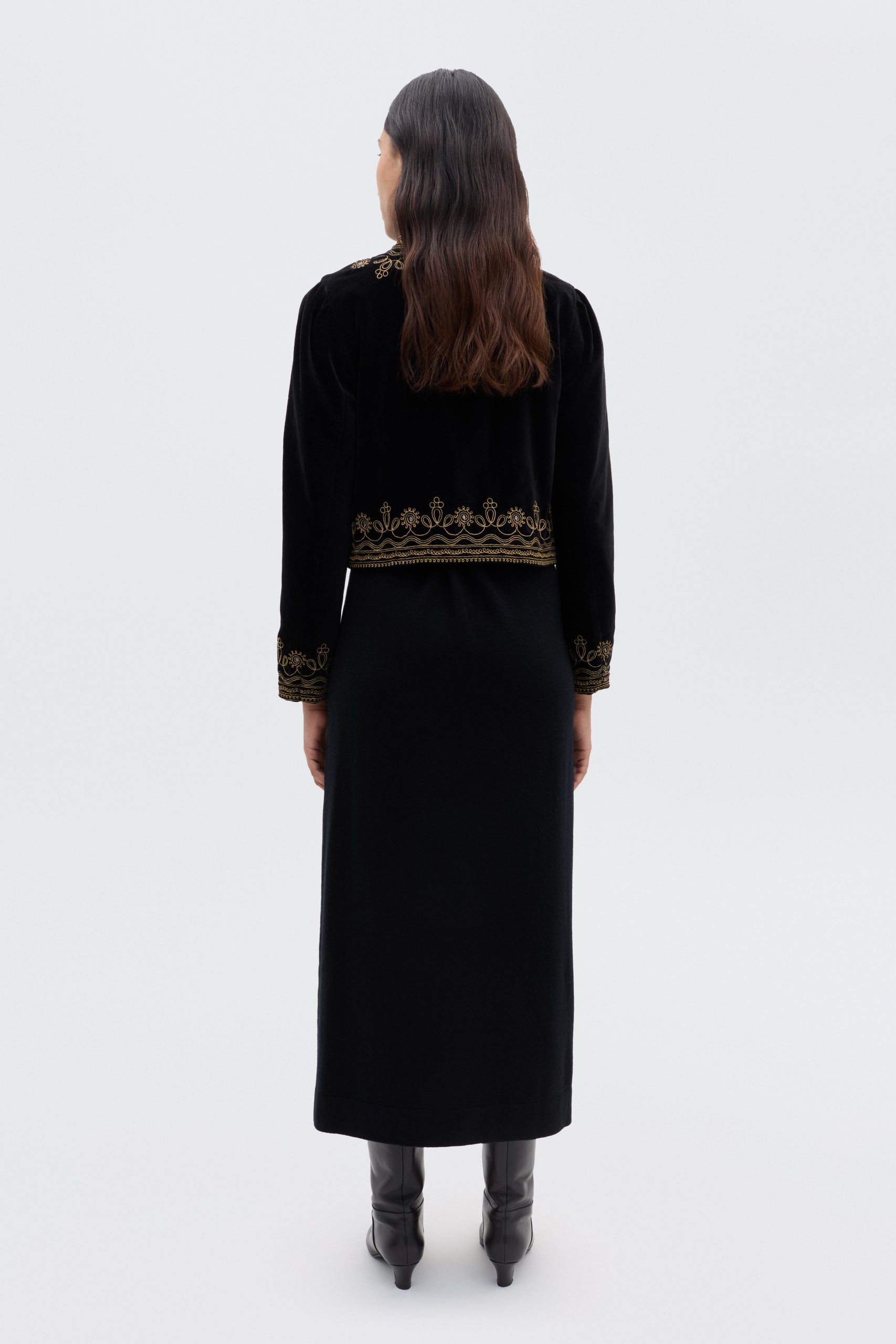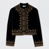 Product detailsDetailsOur Denver jacket gives any outfit that signature RIXO look. It’s made from rich black cotton-velvet, perfect for elevating casual outfits or teaming with dresses – the boxy fit and slightly cropped length is so easy to style. The intricate gold soutache embroidery was designed by hand.Fit