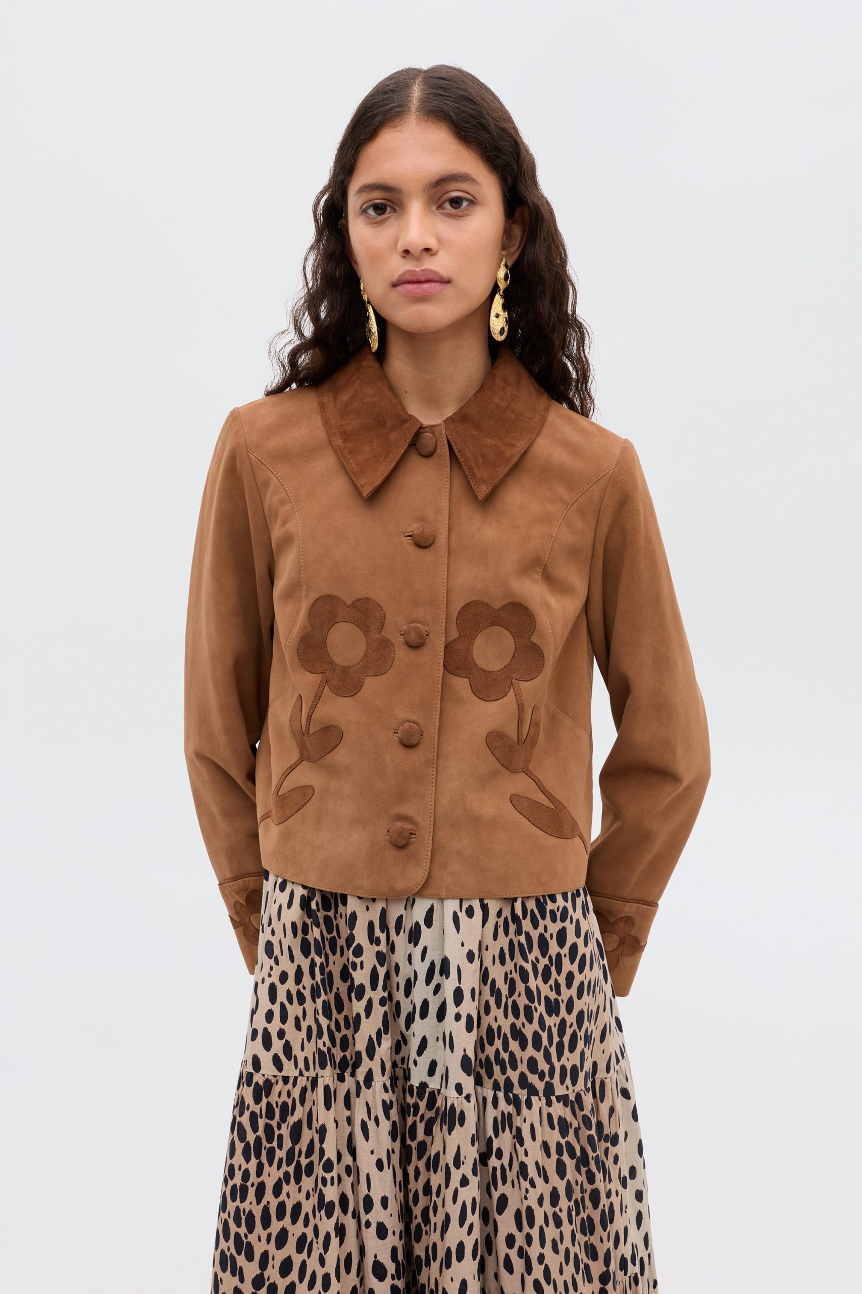 Product detailsDetailsAn archival RIXO piece, Dionne is inspired by vintage souvenir jackets and updated so it fits better than ever. It’s appliquéd with daisies and made from suede that will get even softer with age.Fit