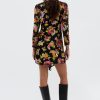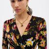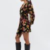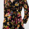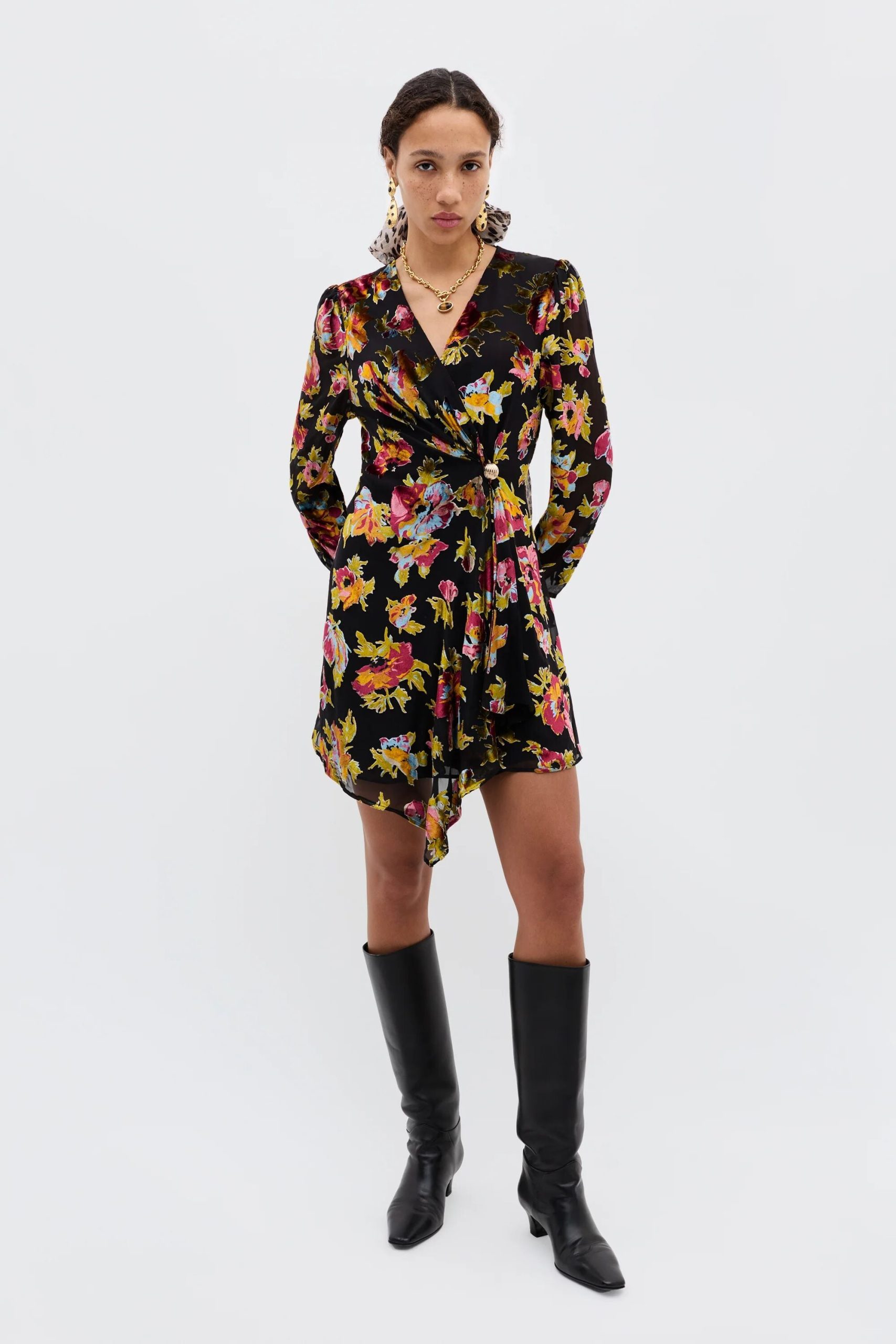 Product detailsDetailsIntroducing the Kensley Dress: Short, sweet and a little bit sexy. The beautiful wrap around fit is finished with an antique-inspired gold button and the hem is asymmetrica playful nod to the vibrant spirit of the ’80s. Crafted from a bright Devoré print but with black as the base colour, there’s a refined maximalism to this style making it the ultimate cocktail dress.Fit