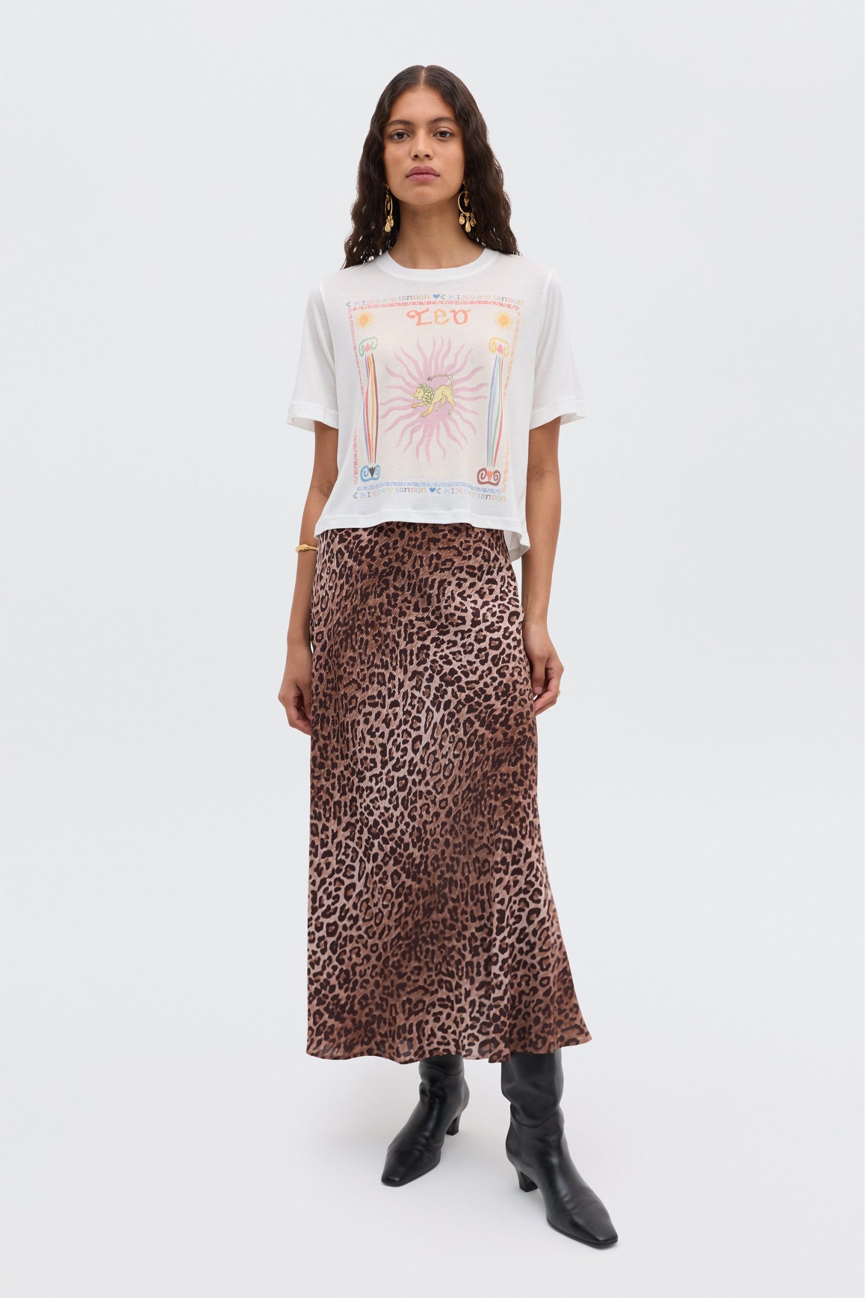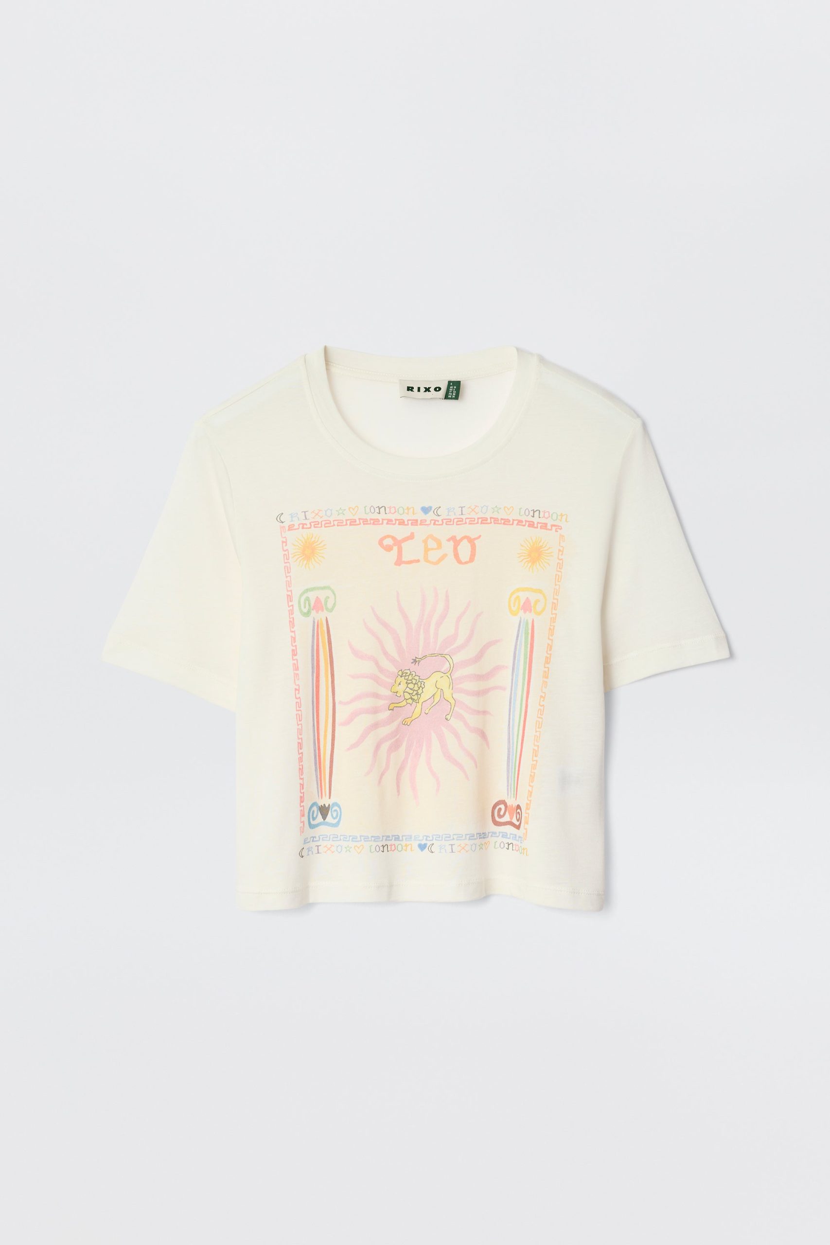 Product detailsDetailsOur Co-founder, Orlagh, sketched this Leo illustration by hand so each Ria T-shirt is unique. It’s made from slightly sheer jersey with a cropped hem that’s easy to tuck into your favourite RIXO skirts.Fit