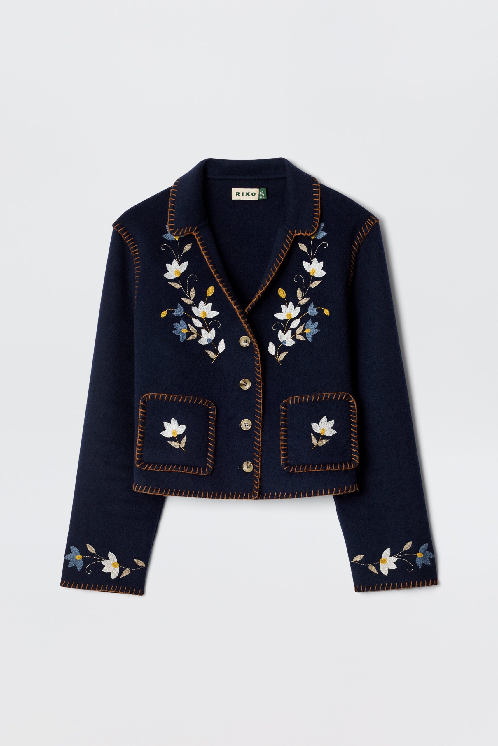 Product detailsDetailsOur Sunday jacket is a RIXO favourite – this one is embroidered with tulips and made from warm wool-blend. The navy base means it goes with everything – a true wardrobe hero.Fit