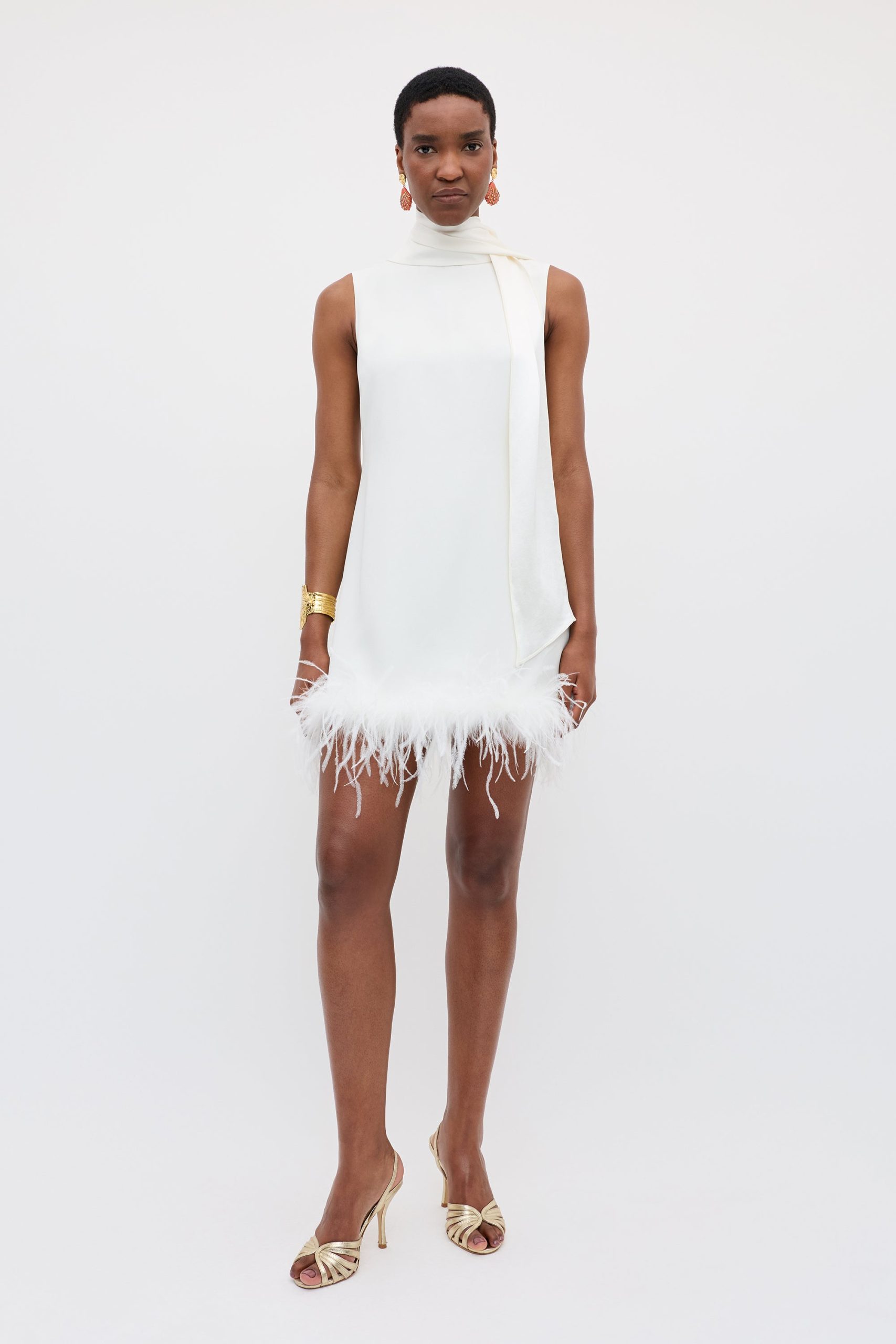 Product detailsDetailsCandice is an elegant sixties-inspired shift dress that will wow your guests. Designed with a Jackie Kennedy-esque rolled neckline and slightly A-line skirt, it’s crafted from silk-crepe with a statement feathered hemline that looks just as striking in person as it does in photographs.Fit