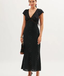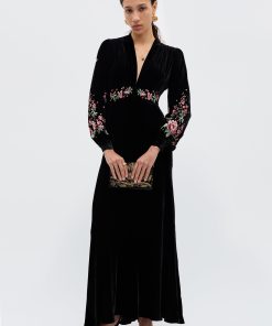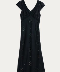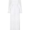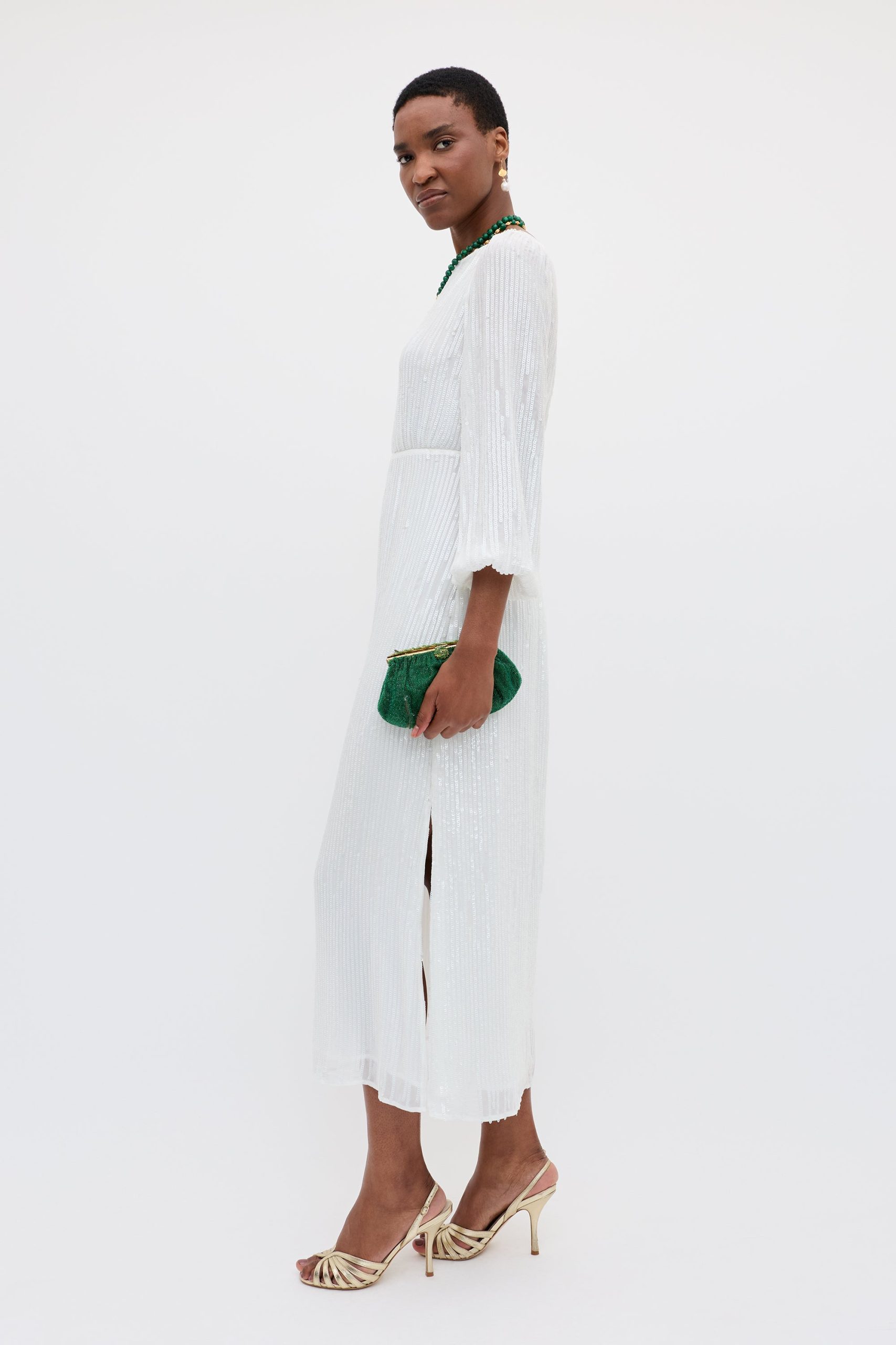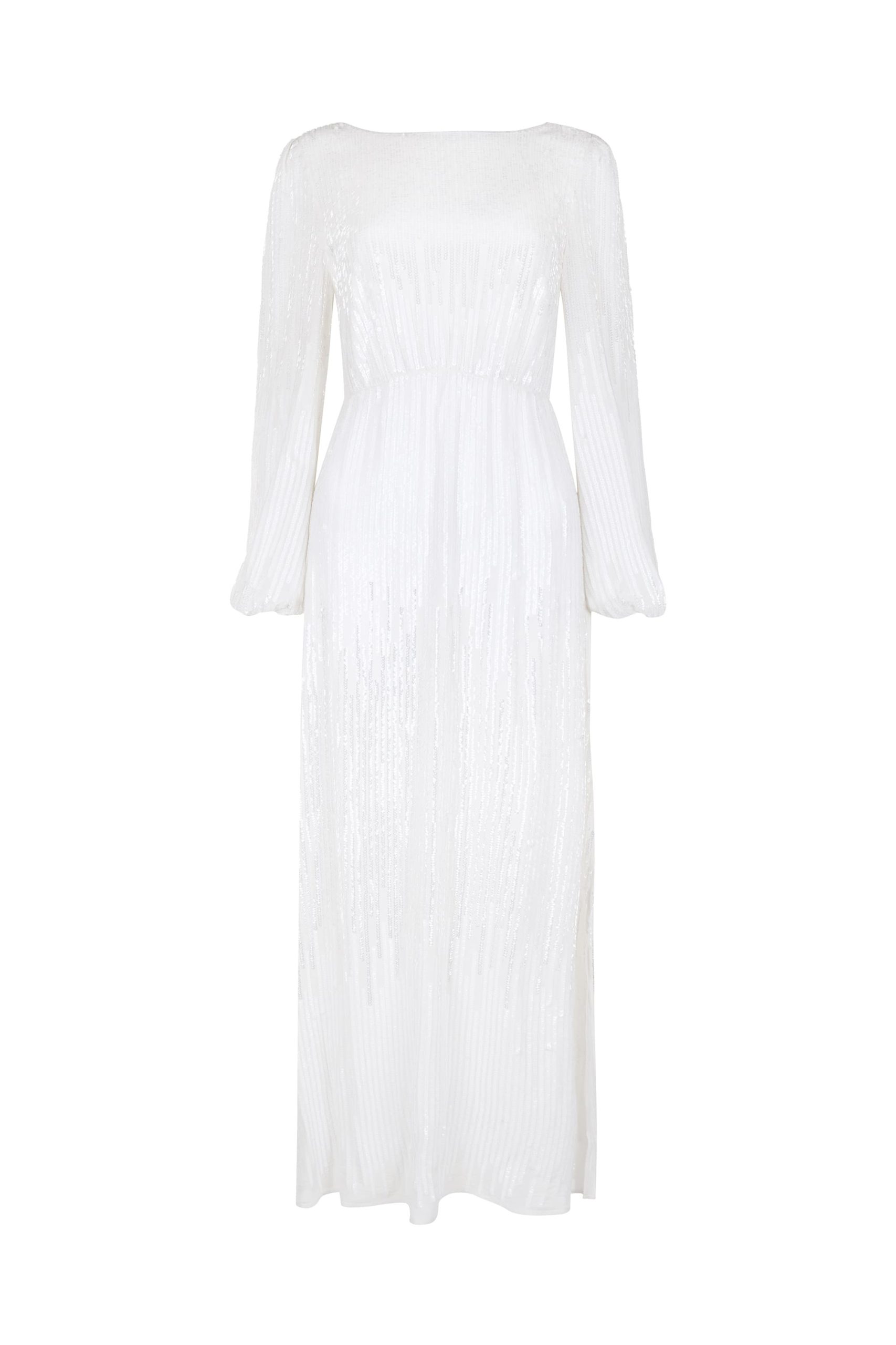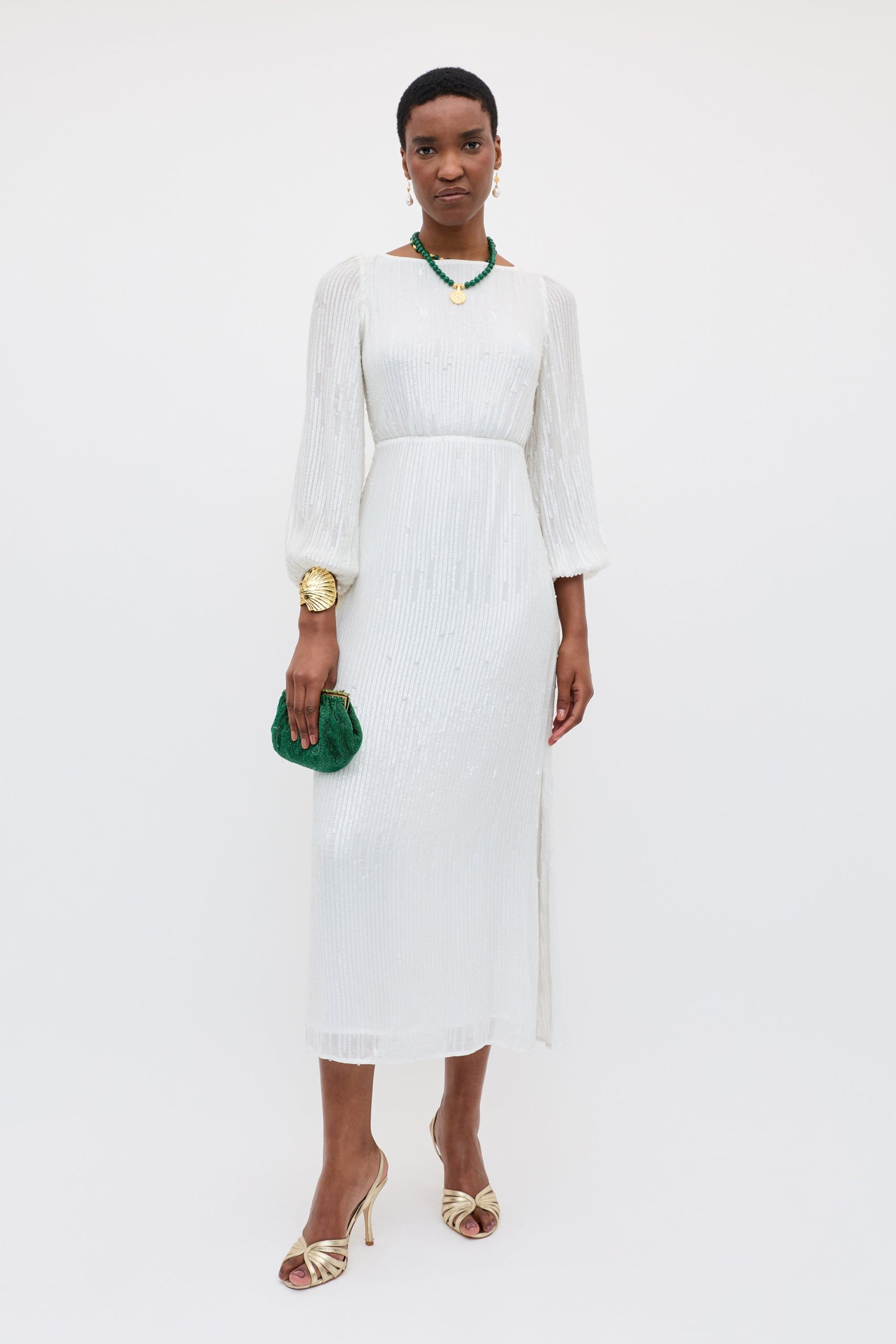 Product detailsDetailsCoco is traced all over with ivory sequins – they flatter the fluid blouson sleeves and figure-skimming, bias-cut skirt. Inspired by vintage wedding gowns, it has a slender keyhole at the back and an elegant boat neckline.Fit