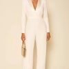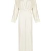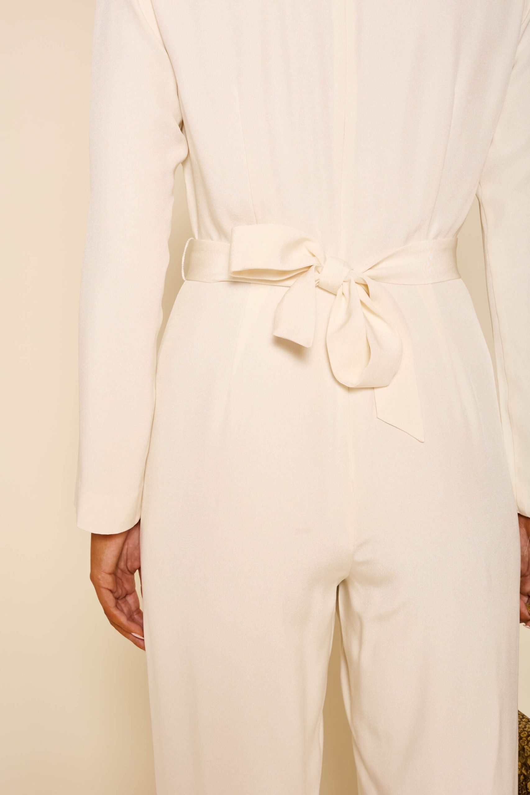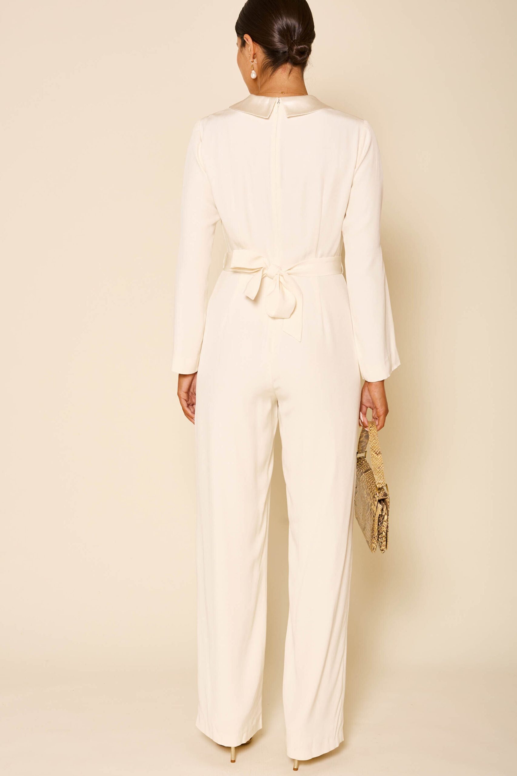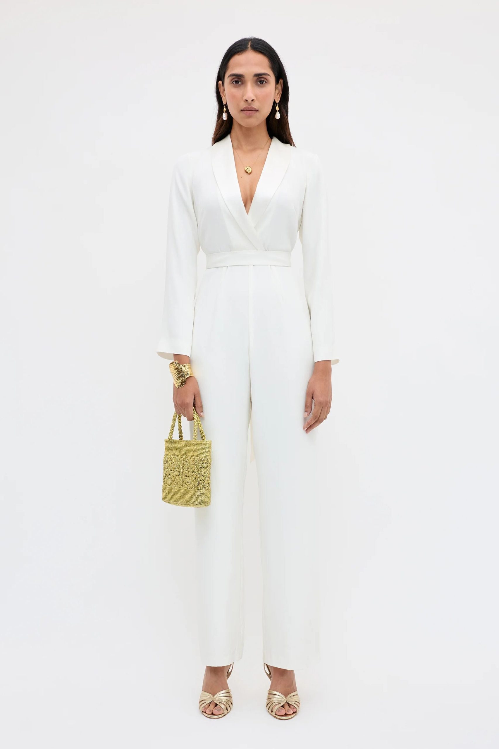 Product detailsDetailsOur Emilia jumpsuit channels Bianca Jagger and her iconic looks from the seventies. It’s tailored from smooth silk crepe de chine with sleek, wide-leg trousers and a plunging neckline that’s wrapped in silk satin to resemble a tuxedo. Carefully considered darts and gathers are positioned for the most flattering fit.Fit