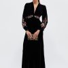 Product detailsDetailsA dress from the 1930s inspired our elegant Emory gown. A bestselling shape, it has a deep but narrow neckline and blouson sleeves. This velvet version is blended with silk and embroidered with tumbling flowers and butterflies.Fit