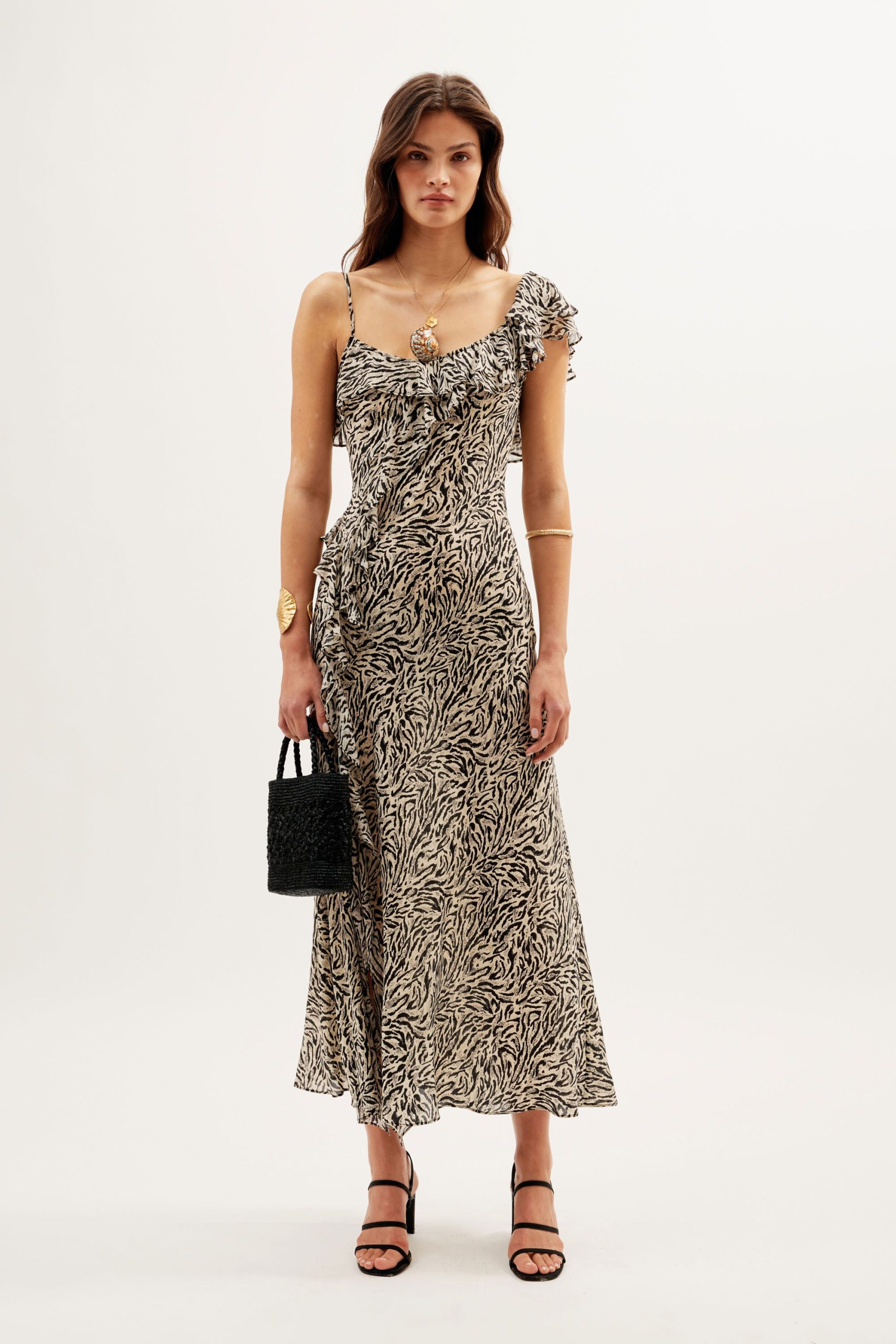 Product detailsDetailsThis Ester dress is inspired by slip styles from the ’90s. It’s made from lightweight silk with an asymmetric neckline and flouncy ruffles that trail down one side.Fit