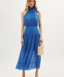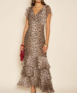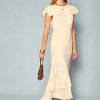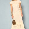 Product detailsDetailsWe think the ruffles lend a vintage feel to this elegant Liberty dress. It’s designed for a slim fit through the body but with cap sleeves and a bias-cut skirt for movement as you walk or dance. This sage version is woven with satin jacquard daisies that catch the light in such a subtle way.Fit