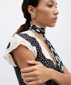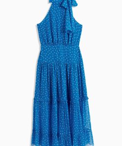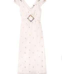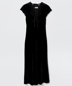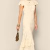 Product detailsDetailsWe think the ruffles lend a vintage feel to this elegant Liberty dress. It’s designed for a slim fit through the body but with cap sleeves and a bias-cut skirt for movement as you walk or dance. This sage version is woven with satin jacquard daisies that catch the light in such a subtle way.Fit