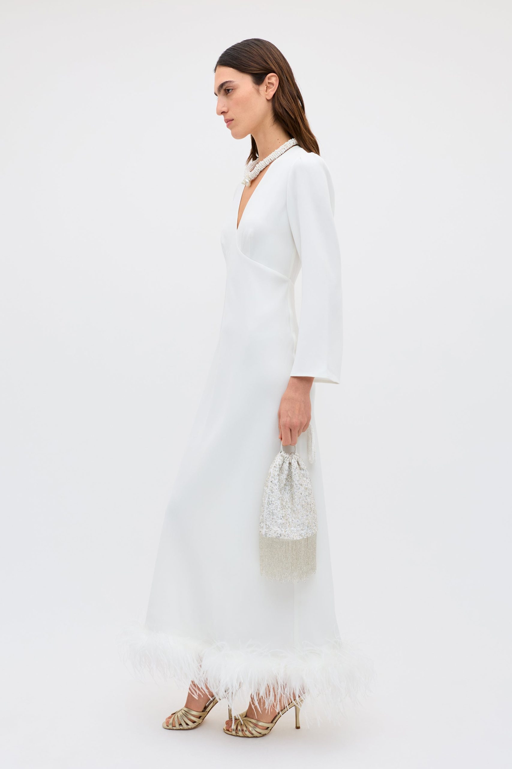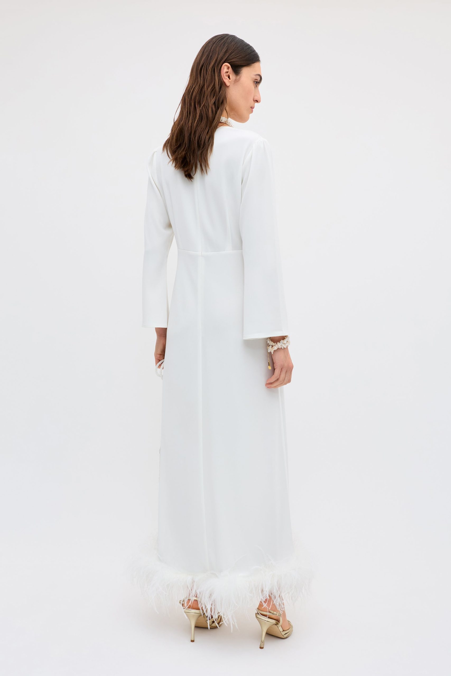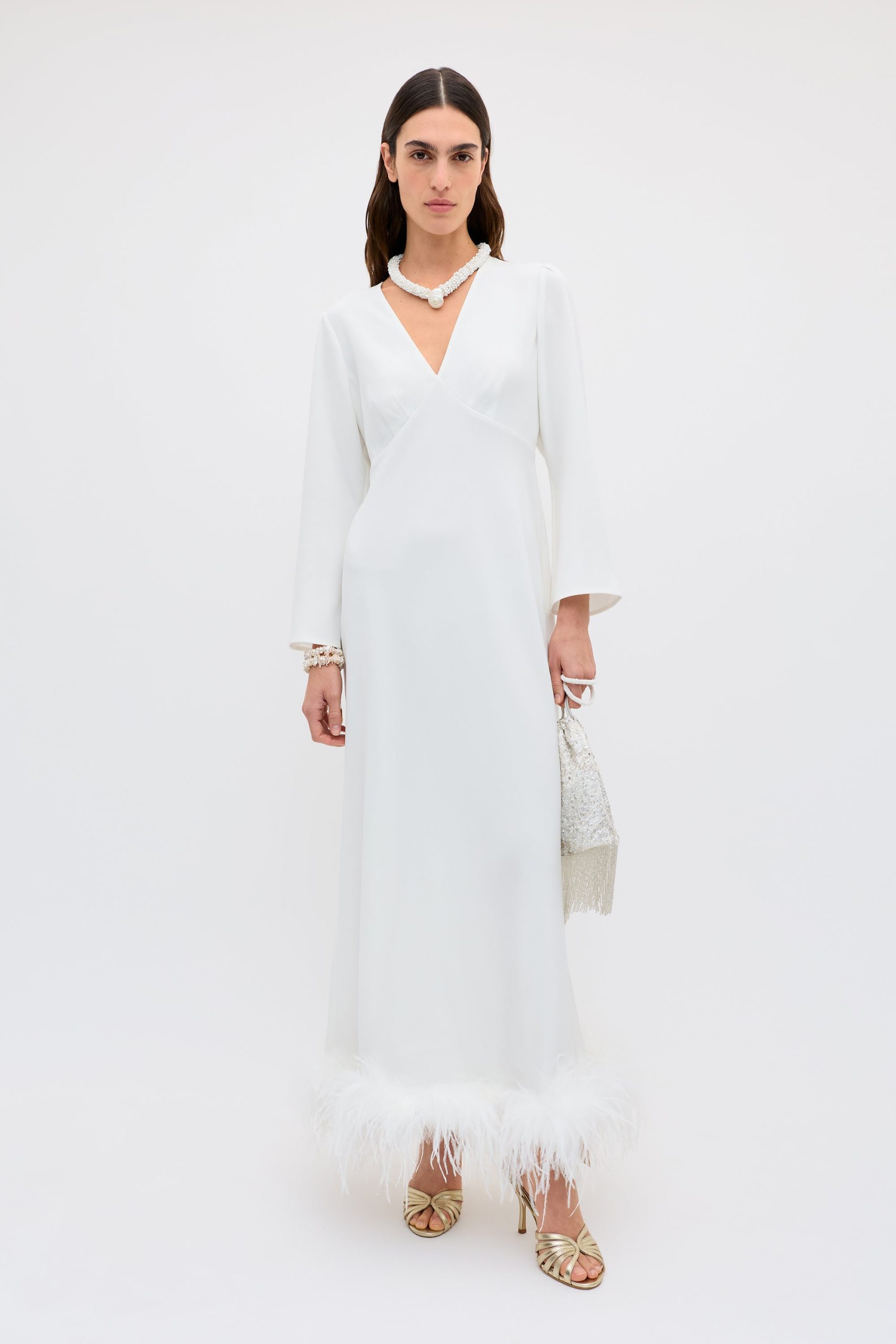 Product detailsDetailsOur Mya gown is simple but beautifully striking thanks to the dramatic feather-trimmed hem. It’s tailored in our signature bias-cut shape, with flared sleeves and underbust seams that nip in at the waist. Prefer a mini? You’ll love Toni.Fit
