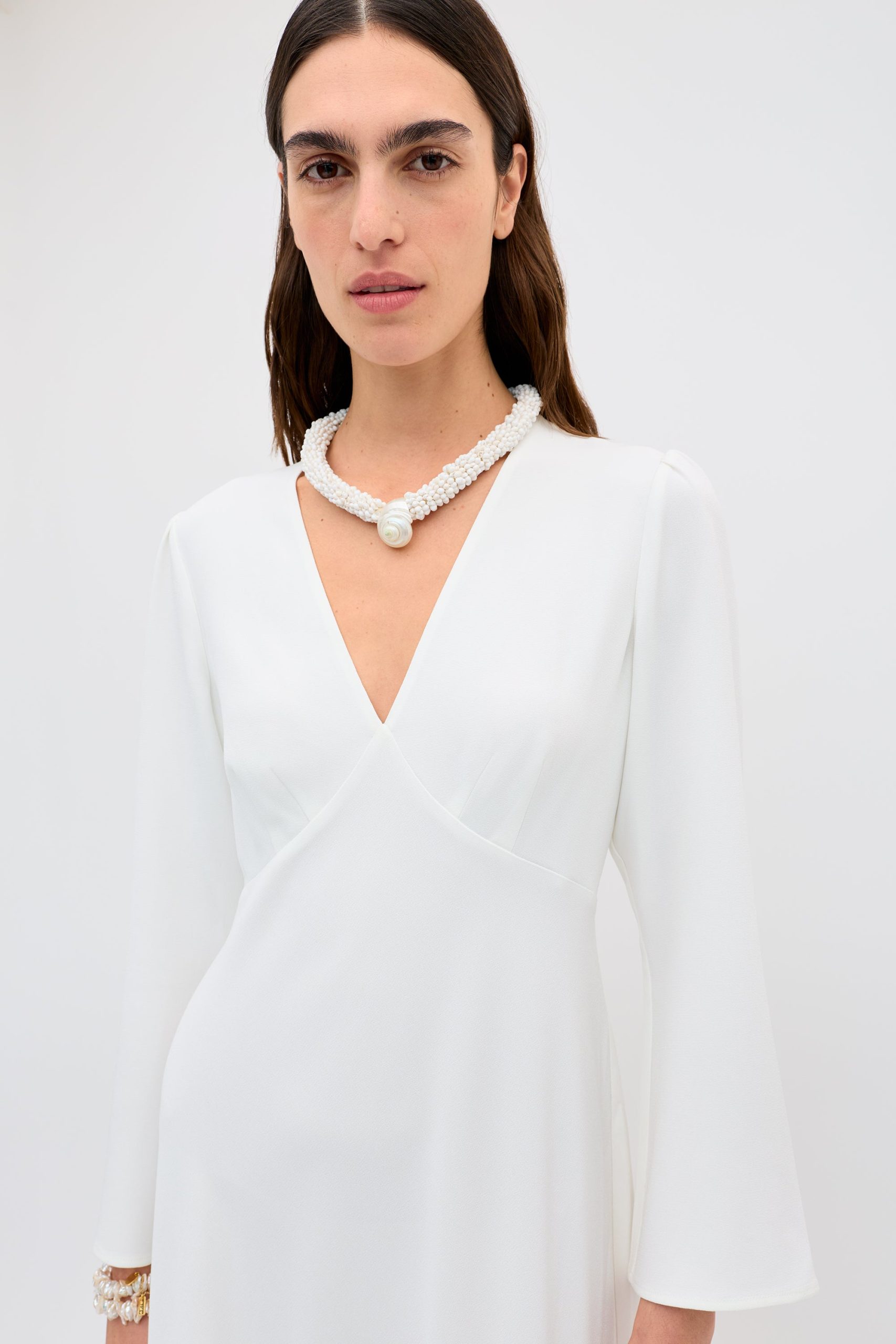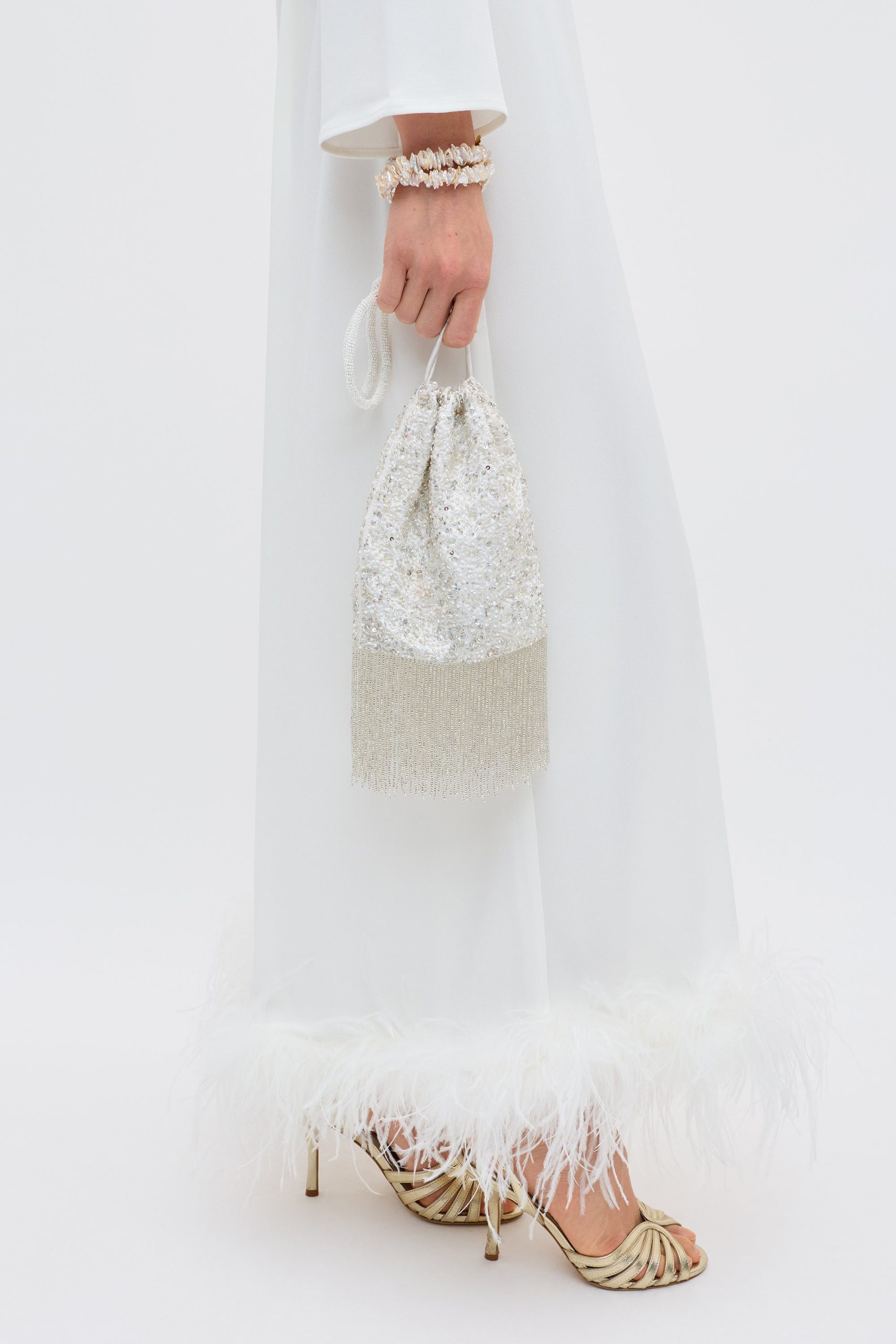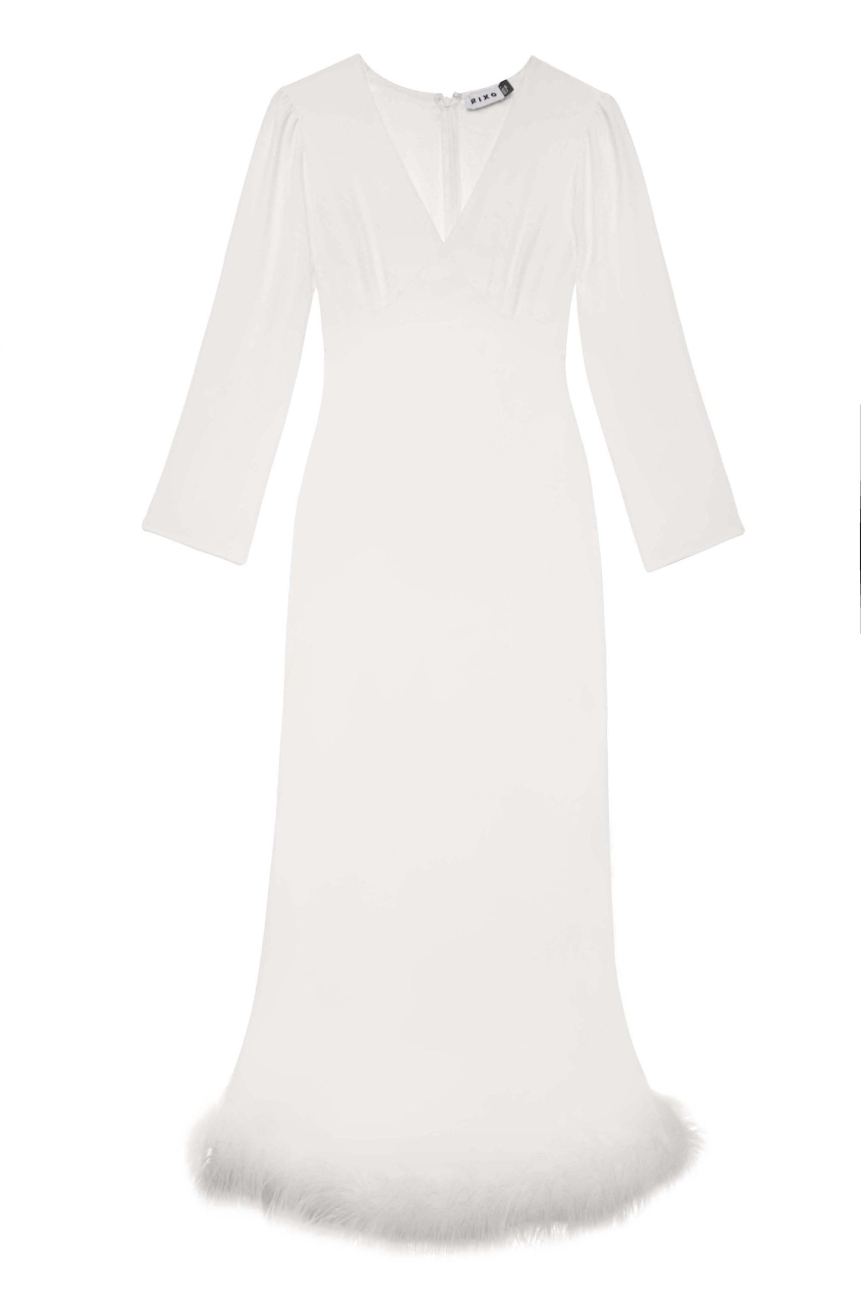 Product detailsDetailsOur Mya gown is simple but beautifully striking thanks to the dramatic feather-trimmed hem. It’s tailored in our signature bias-cut shape, with flared sleeves and underbust seams that nip in at the waist. Prefer a mini? You’ll love Toni.Fit